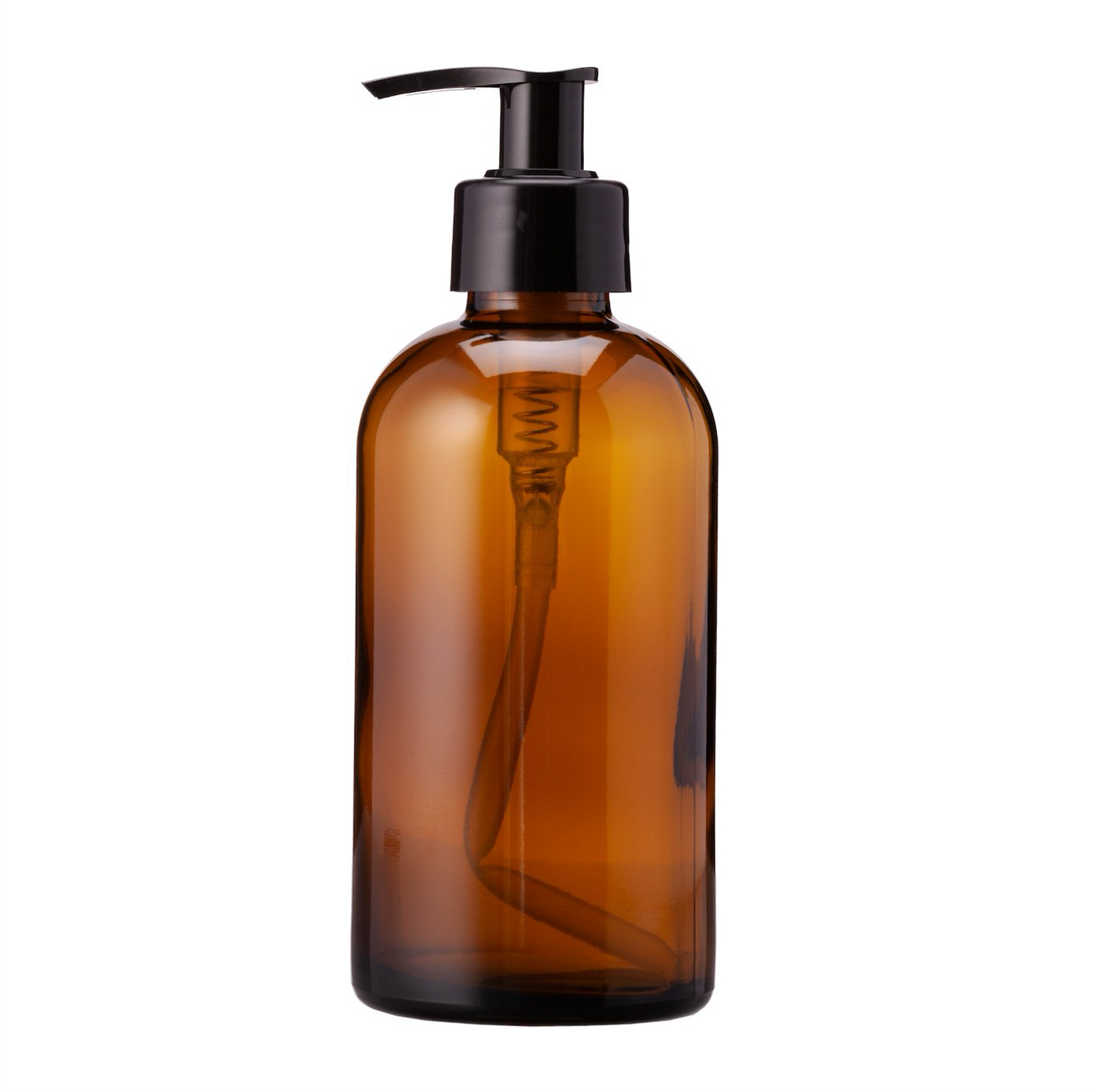 Glasflasken er i brunt glas og med en sort pumpe, som ser æstetisk ud i ethvert køkken eller badeværelse.
